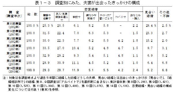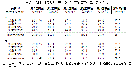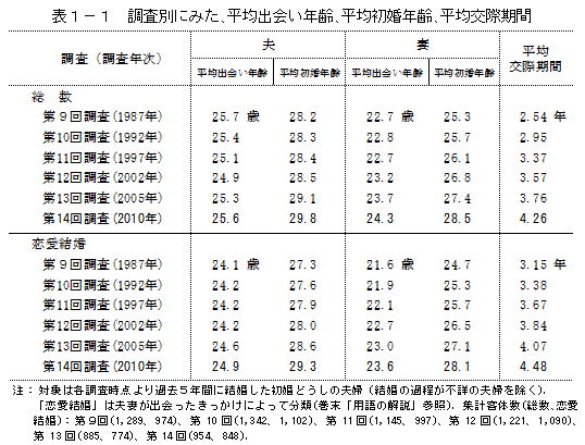 過去5年間の結婚について、夫妻が初めて出会った時の平均年齢は、夫25.6歳、妻24.3歳であり、ともに上昇した(表1-1)。また、出会ってから結婚するまでの平均交際期間は4.3年となっており、この項目の調査を始めた第9回調査(1987年)に比べると1.72年(68%)も長くなった。夫妻が25歳までに出会う割合(表1-2)は、夫の場合約半数(49.6%)、妻では約6割(57.4%)であり、全体として出会いが遅くなっている。これらの変化の結果、平均初婚年齢はいぜん上昇を続けており、晩婚化が進行している。