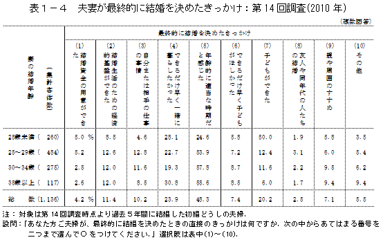 夫妻が最終的に結婚を決めたきっかけについて見ると、妻の結婚年齢が25歳未満の夫婦では「子どもができた」ことを挙げた夫婦が最も多く、半数(50.0%)を占めている。25歳以上では「子ども」は減り、「年齢的に適当な時期だと感じた」ことが半数を超える。